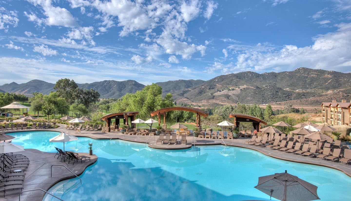 Welk Resort San Diego is a Southern California vacation all suite/villa Resort and Water Park offering couples and families a memorable San Diego getaway. Just minutes from world famous destinations San Diego Zoo's Safari Park (20 minutes), LEGOLAND (25 minutes), San Diego Zoo (40 minutes), San Diego Gaslamp District (35 minutes), SeaWorld (40 minutes) Temecula wineries, area casinos, and some of the most beautiful beaches in the world are just 30 minutes away! This resort offers luxurious one and two bedroom villa suites, with panoramic views of golf courses or surrounding mountains. Villas include sitting and dining areas, complete kitchens with full cookware and dishware, patios or balconies, and complimentary WiFi access. Parking is complimentary and there are no resort fees. Guests will experience can enjoy fun in the sun at Five Clubhouses featuring one colossal pool and seven large pools & 8 spas, two water slides, two kids' splash pads and playgrounds, table games, catch and release fishing pond, hourly planned activities for all age groups, new for 2016 state of the art fitness center, lighted tennis courts, and a relaxing round of golf on one of two 18 hole golf courses. The Welk Resort Theatre is home to top-notch talent performing Broadway style musicals and starring in comedy and variety shows, including tribute bands. During the Summer are music festivals at the Welk Amphitheatre on the Greens.